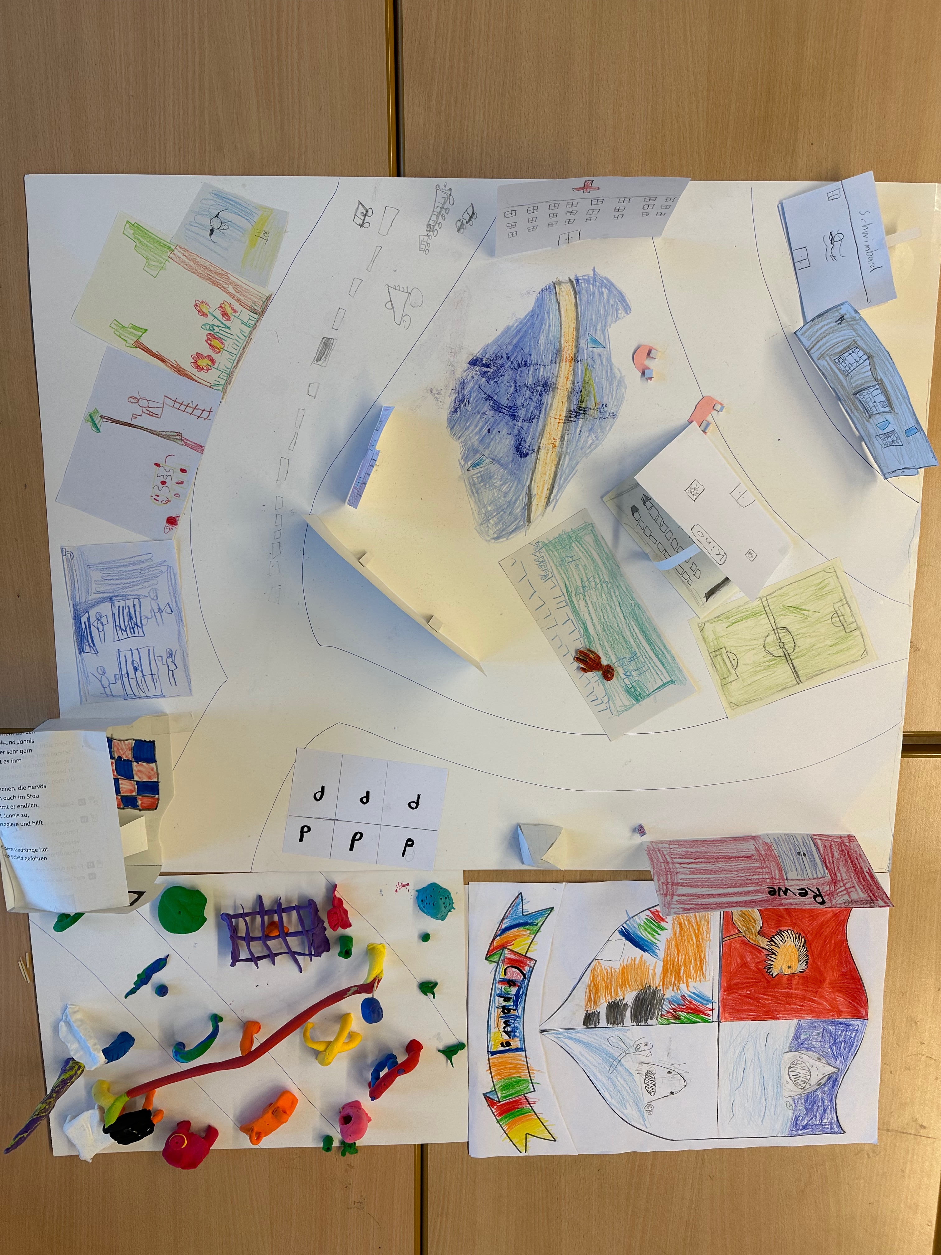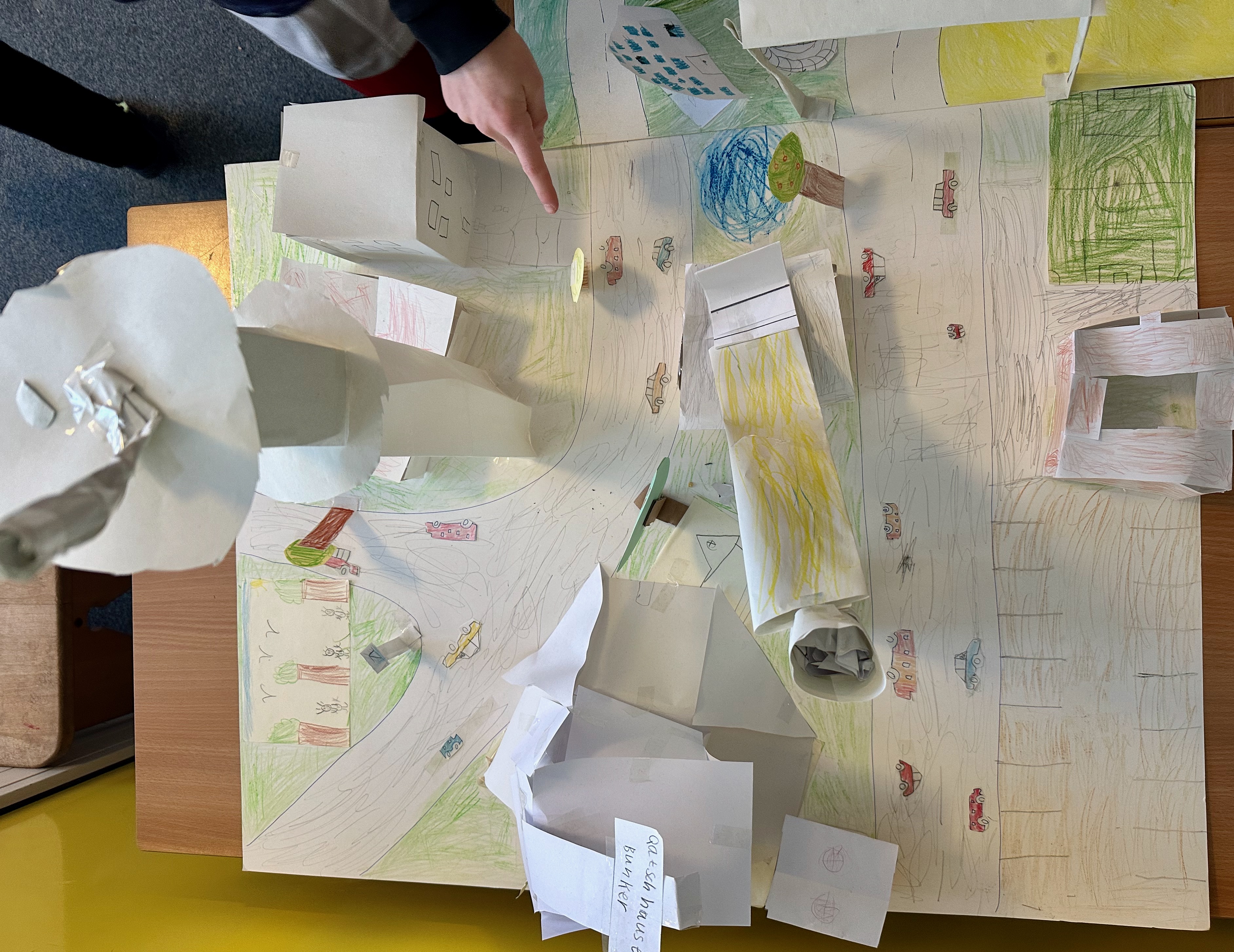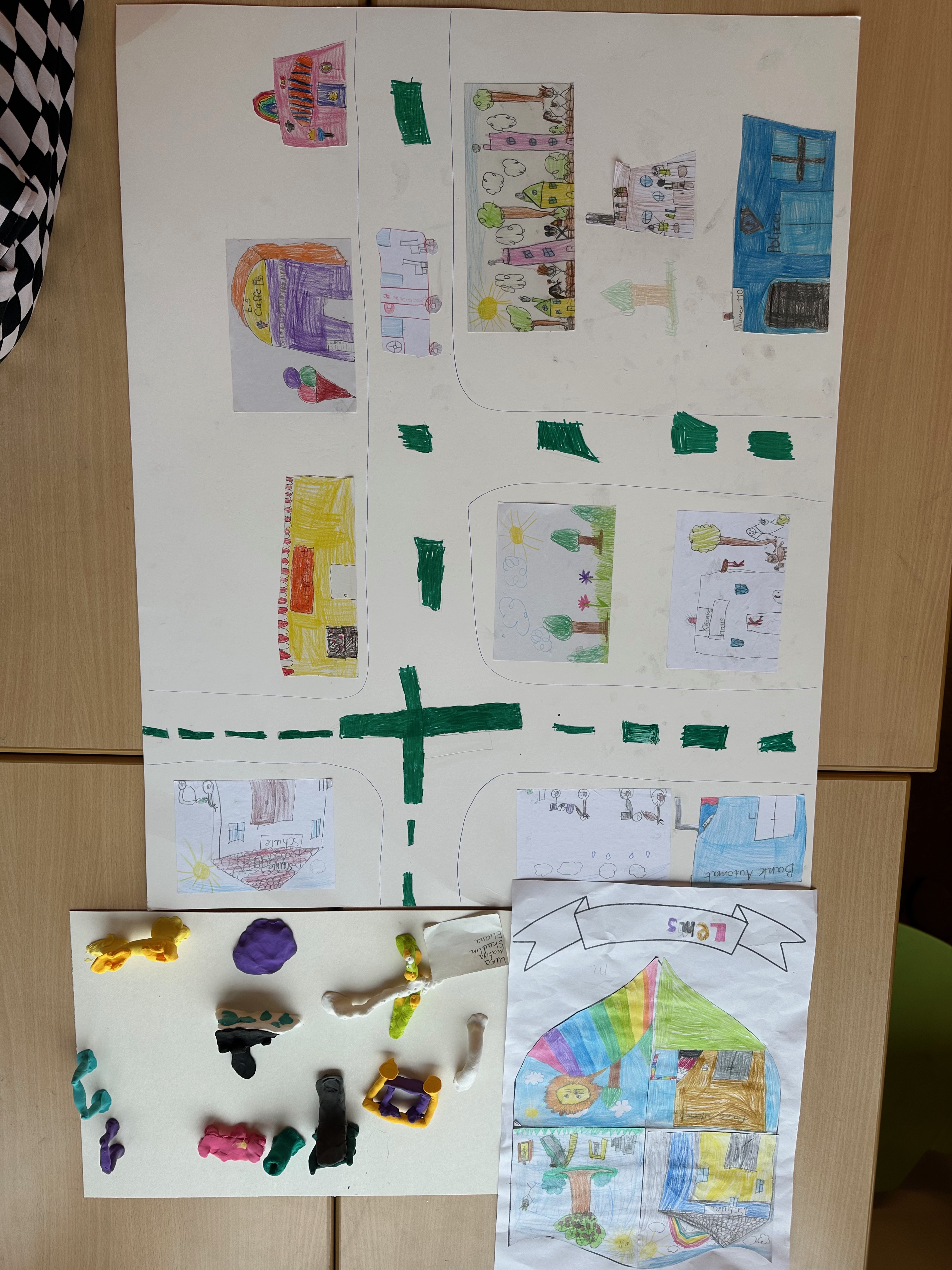 Am Anfang haben wir erst einmal gelernt, was ein Stadtteil überhaupt ist. Dann haben wir auf einer Karte von Hamburggesucht, wo genau Schnelsen liegt. Das war spannend! Danach durften wir in Vierer-Teams unseren eigenen Stadtteil erfinden. Wir haben überlegt: Was braucht man eigentlich, damit man dort gut leben kann? Uns sind ganz viele Ideen eingefallen! Wir haben Krankenhäuser, Friseursalons, Läden und Häuser gemalt und gebastelt. Straßen, Bäume und ein Spielplatz durften natürlich auch nicht fehlen.