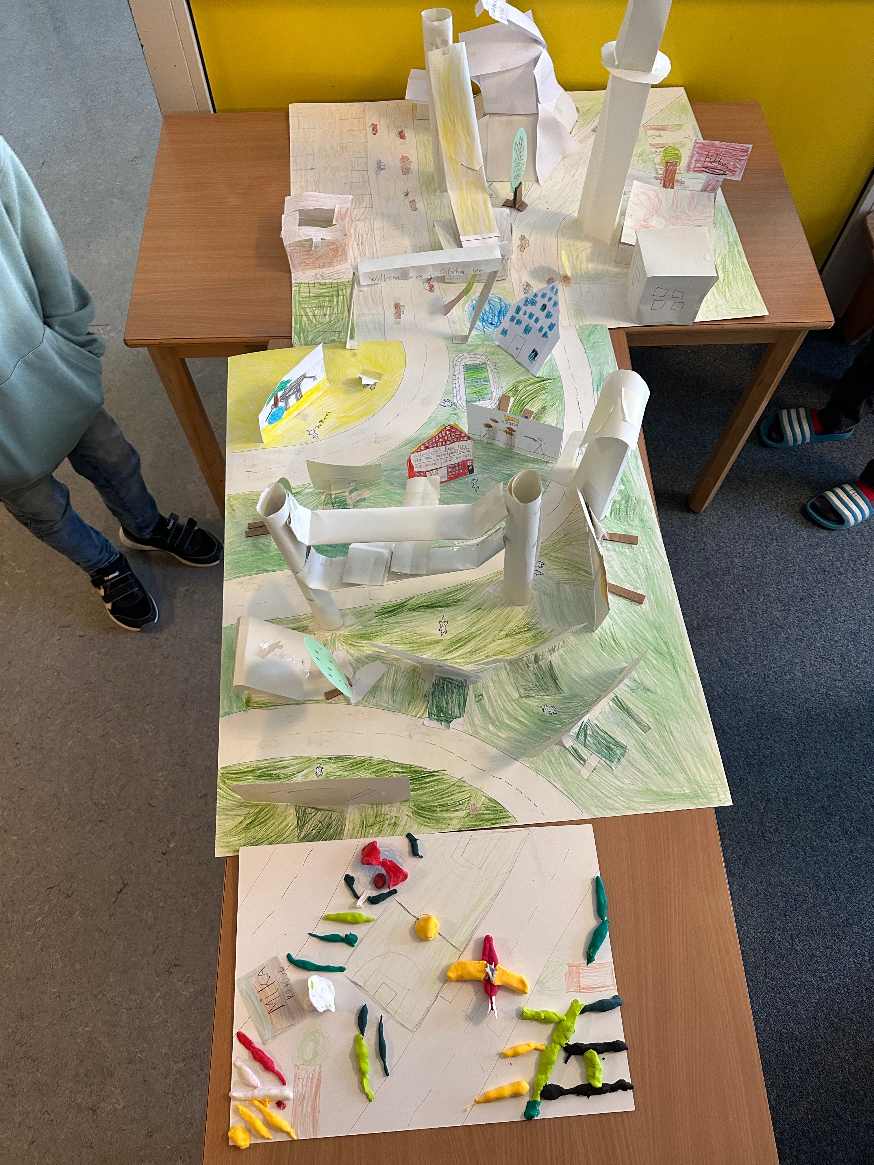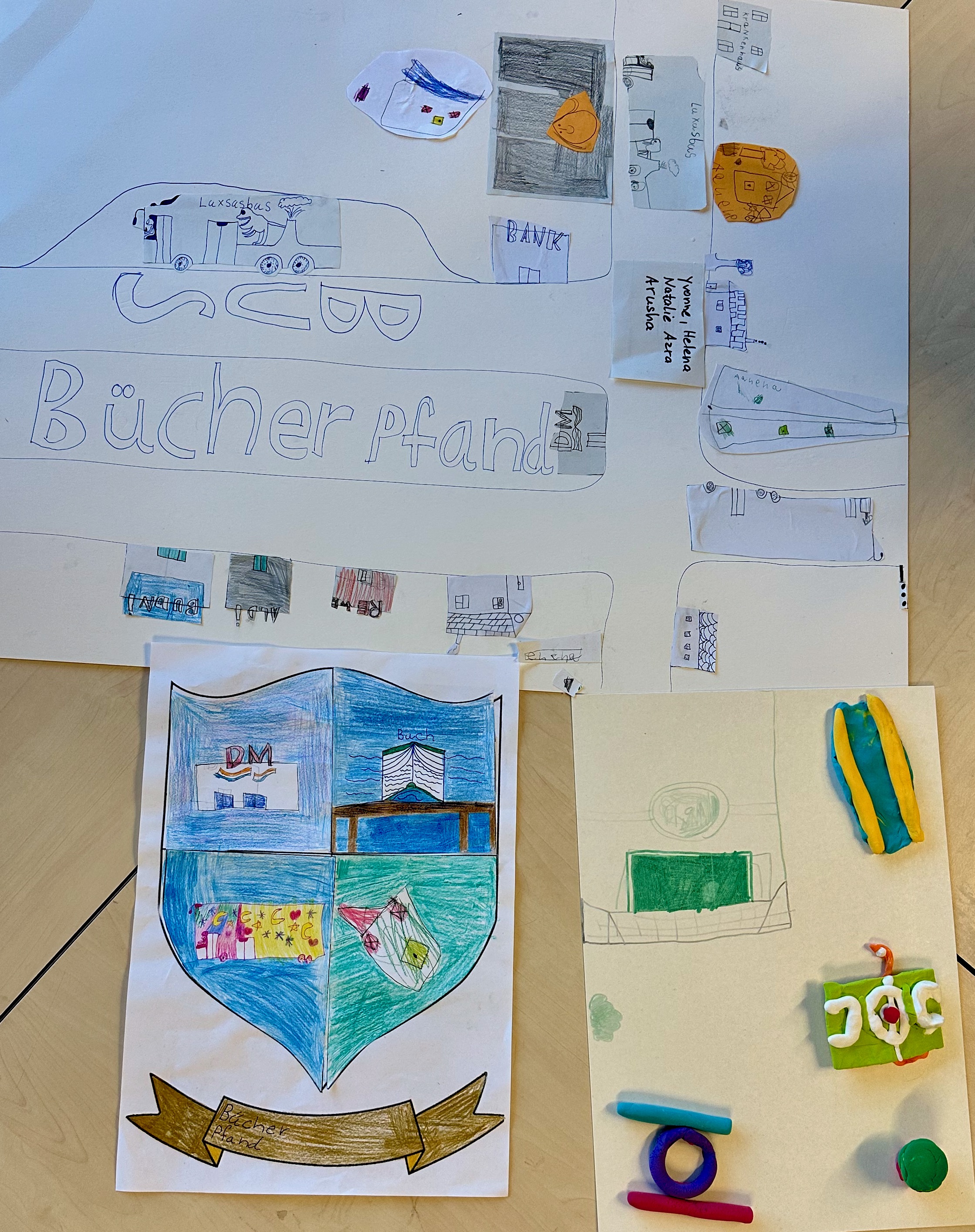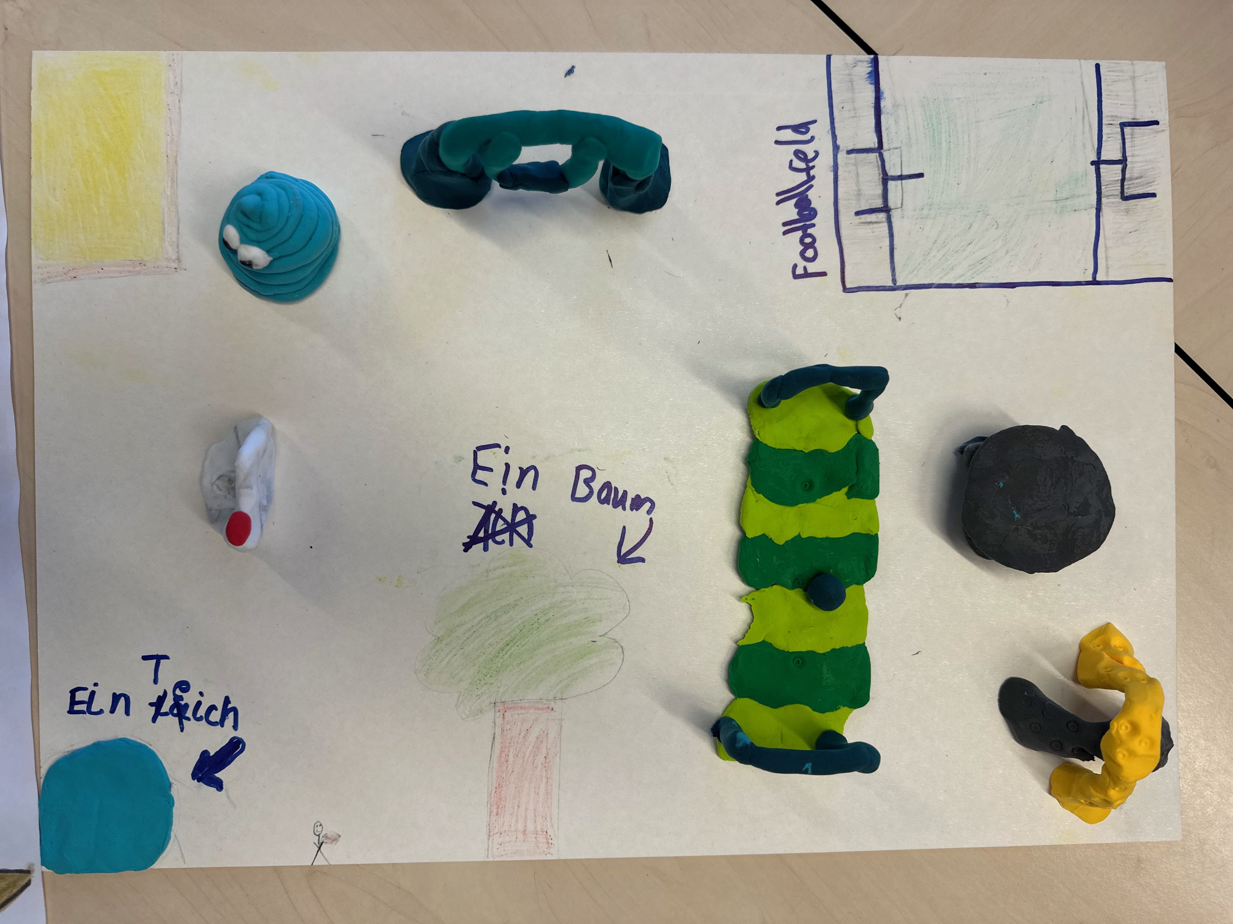 Weil unsere Schule im Märchenviertel liegt, haben wir am vierten Tag auf einer Straßenkarte nach Straßen gesucht, die nach Märchen benannt sind. Wir haben viele tolle Namen entdeckt. Dann haben wir aus Knete unsere Traum-Spielplätze gebaut. Die sahen richtig cool aus!