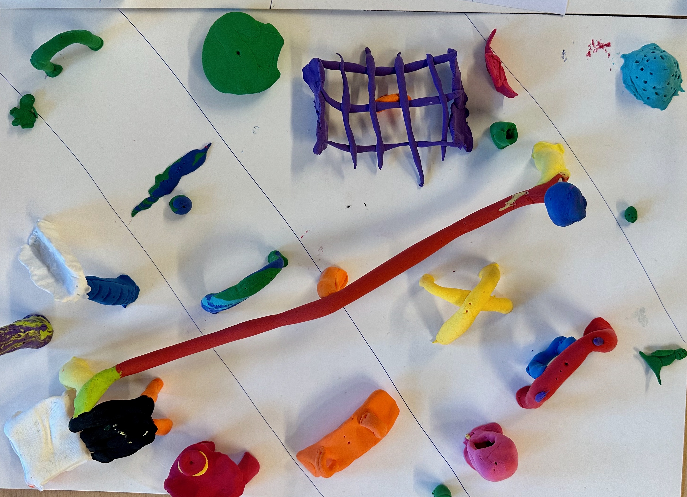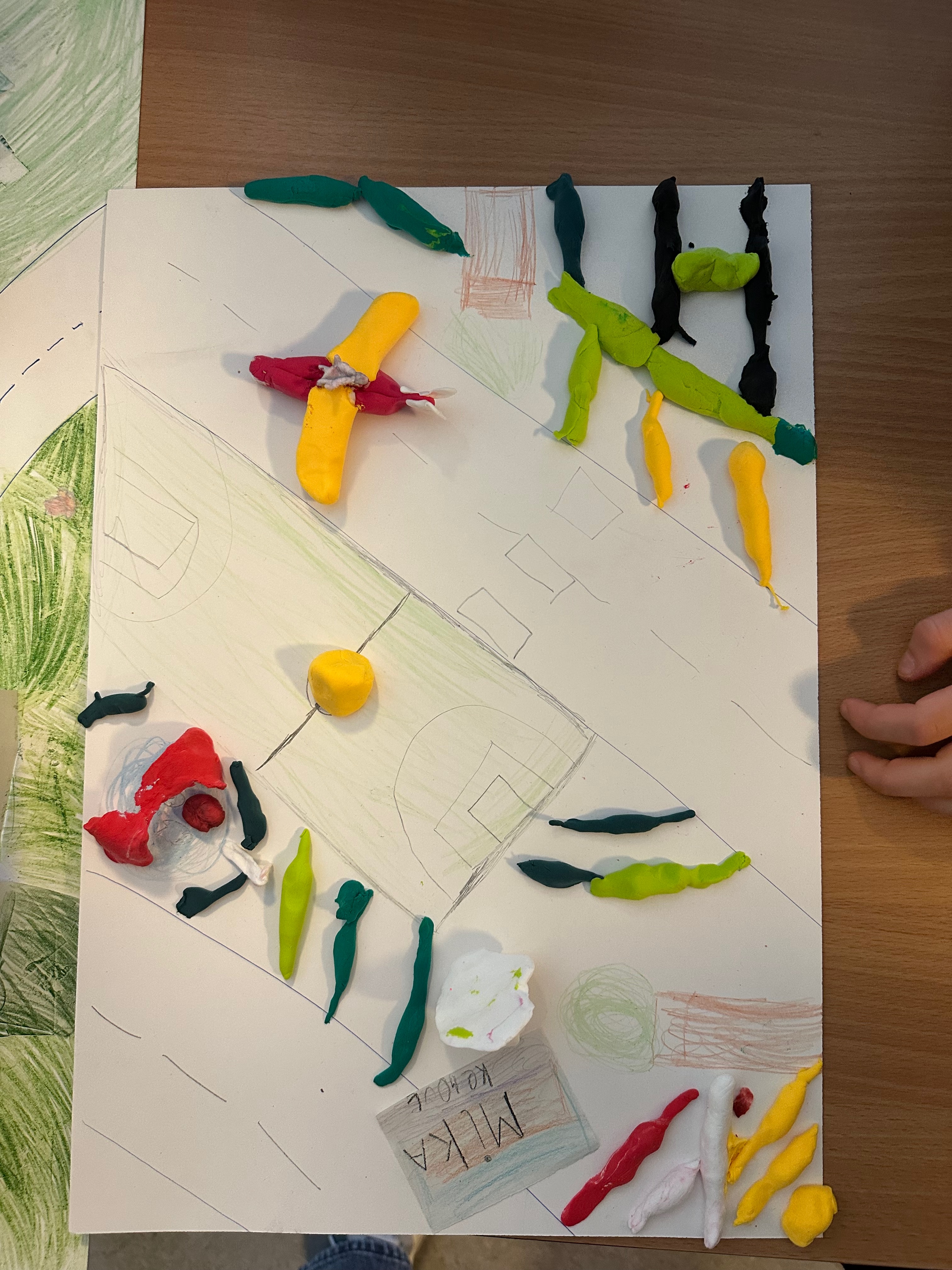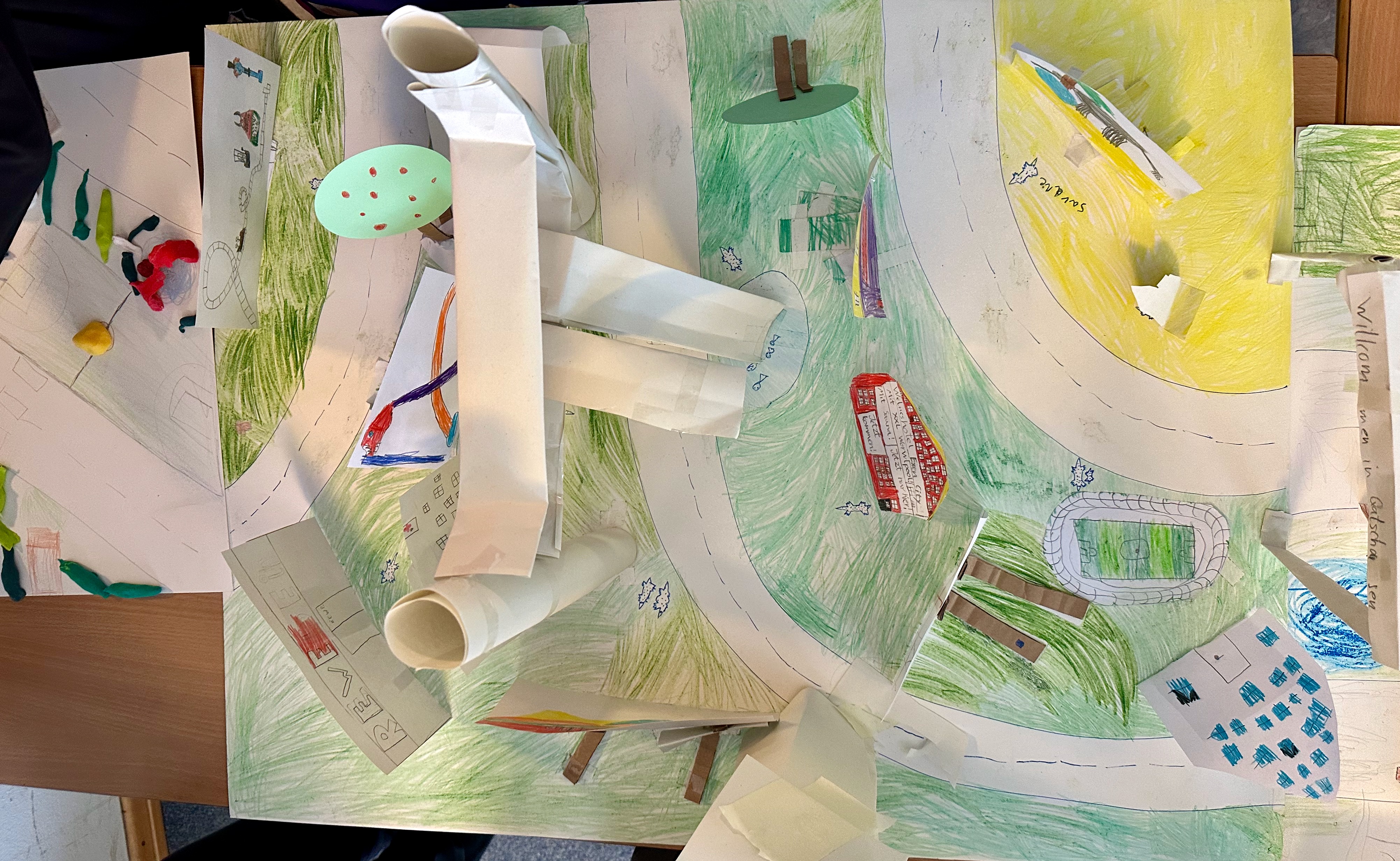 Weil unsere Schule im Märchenviertel liegt, haben wir am vierten Tag auf einer Straßenkarte nach Straßen gesucht, die nach Märchen benannt sind. Wir haben viele tolle Namen entdeckt. Dann haben wir aus Knete unsere Traum-Spielplätze gebaut. Die sahen richtig cool aus!